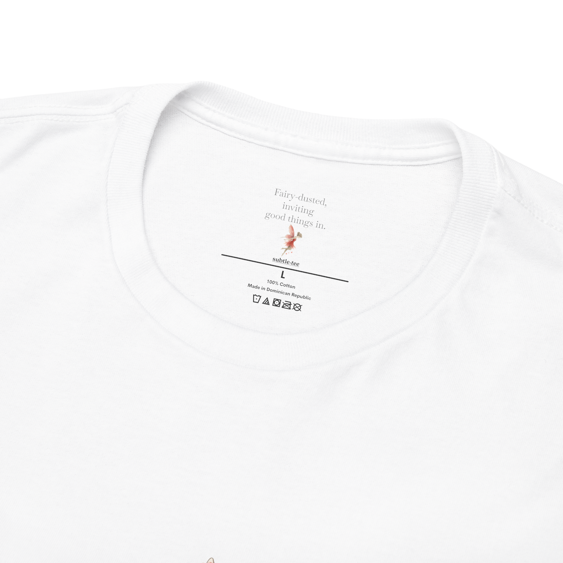 A delicate fairy illustration sits quietly at the centre of the chest, subtle and understated. Inside the collar, a hidden blessing waits - a private message of lightness, luck, and openness to good things.